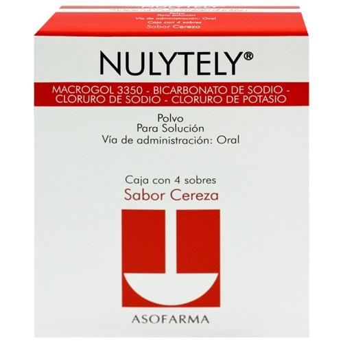Cada sobre de Nulytely contiene: polietilenglicol 3350, electrolitos como cloruro de sodio, bicarbonato de sodio, cloruro de potasio y galactosa, en una formulación equilibrada que favorece la osmolaridad durante la evacuación intestinal.